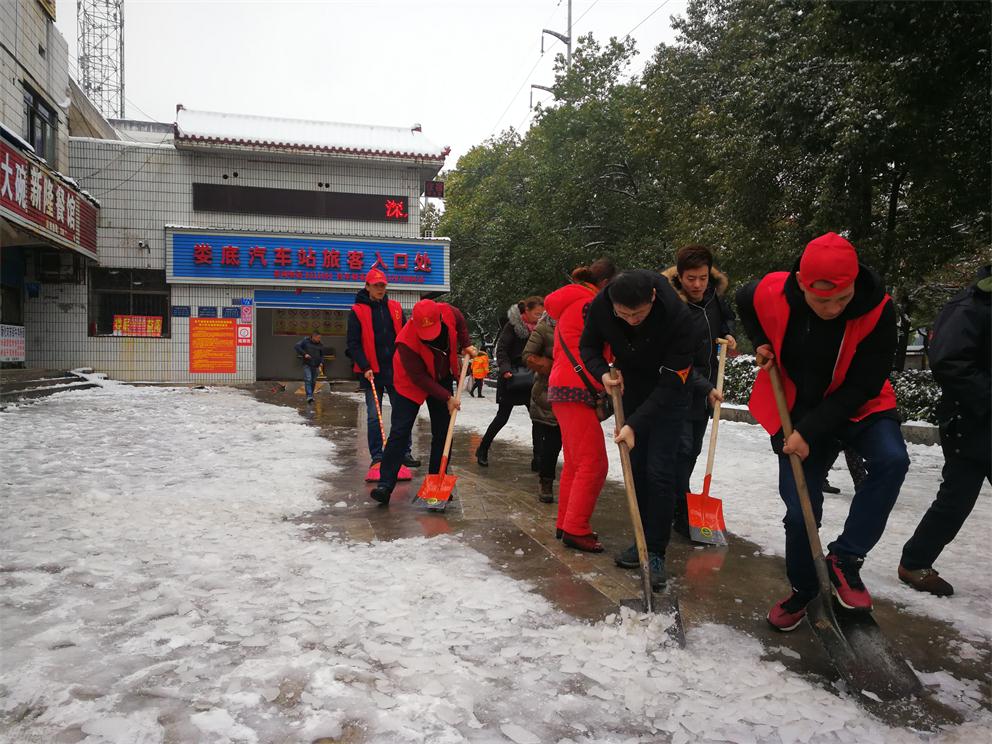 一場(chǎng)大雪像是為了迎接新年的到來(lái),在2018年年末的午夜悄然而至,先是雪沙狂灑,爾后雪花不知疲倦的翩翩起舞,全城銀裝素裹,地上積雪高達(dá)80CM,潔白的雪花給人們帶來(lái)了喜悅的心情及瑞雪兆豐年的好兆頭,但也給公路出行帶來(lái)了不便。因積雪太厚,車站的客運(yùn)班線車輛只能全線停運(yùn),但還是有些想出行的市民來(lái)車站詢問(wèn)車輛運(yùn)行情況和購(gòu)買預(yù)售票。由于站場(chǎng)積雪、結(jié)冰現(xiàn)象嚴(yán)重,為防止旅客走路滑跌,同時(shí)及時(shí)做好班線復(fù)班準(zhǔn)備,婁客司經(jīng)理?xiàng)罡渡甘抉R上啟動(dòng)“破冰鏟雪”活動(dòng)方案,由車站領(lǐng)導(dǎo)組織車站學(xué)雷鋒志愿者開(kāi)展“鏟雪刨冰”活動(dòng)。