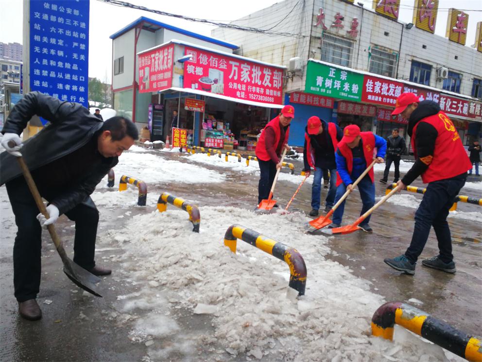 早上八點(diǎn)半,在車站生產(chǎn)副經(jīng)理付育平帶領(lǐng)下,辦公室、調(diào)度、稽查大隊(duì)、營(yíng)收監(jiān)控隊(duì)、服務(wù)班、安保等部門近20多名志愿者拿著鏟子、鐵鍬和竹掃把等工具,對(duì)車站旅客入口處通道、車輛進(jìn)站通道、車站站坪、短途通道、車輛出站通道等地的堅(jiān)冰進(jìn)行鏟除,寒風(fēng)凜冽,積雪厚重,冰塊堅(jiān)硬,但我們的雷鋒志愿者們熱情高漲,大家發(fā)揚(yáng)不怕若不怕累的精神,齊心協(xié)力,分工合作,揮鍬掄鎬,鉚足了勁,發(fā)起了挑戰(zhàn)嚴(yán)冰暴雪的攻堅(jiān)戰(zhàn),在車站奏響了美妙的樂(lè)意,汗水濕透了背脊,手掌磨起了血泡,冰雪打濕了鞋襪,大家全然不顧,只看見(jiàn)一頂頂小紅帽在雪地上不停的運(yùn)轉(zhuǎn),很多駕駛員和班線承包人紛紛加入鏟雪隊(duì)伍,婁星微馬隊(duì)的20多名隊(duì)員們?cè)谒麄冴?duì)長(zhǎng)的帶領(lǐng)下也來(lái)到車站幫著一起鏟雪除冰,他們橙色的微馬隊(duì)服也是一道道靚麗的風(fēng)景線。大家都有一個(gè)共同的名字——學(xué)雷鋒志愿者!他們的一言一行彰顯真情,贏得了過(guò)路市民的連聲稱贊!