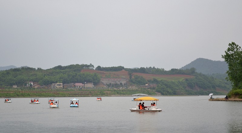 因先前聯(lián)系好了,山莊的王經(jīng)理早早就在等候我們,她把游玩的票發(fā)給大家。大家開(kāi)始放飛了!有垂釣愛(ài)好者拿著早早準(zhǔn)備好的釣桿開(kāi)始在河邊占地盤(pán),喂魚(yú)食,裝蚯蚓,靜坐,大有一副姜太公釣魚(yú)之勢(shì)!不禁猜他們真正想做的不全是釣魚(yú),而是一種心境!有的結(jié)伴沿著“湘軍橋”觀賞曾國(guó)藩、左宗棠筆墨,大聲朗誦詩(shī)詞,頗有文人風(fēng)范;有喜歡劃船的同事們來(lái)這尋找童年的步伐,三個(gè)一行,五個(gè)一伙,為安全起見(jiàn),每個(gè)船上坐一位男同胞,漾著小船在河中嘻水,唱山歌;也有一些同事們爬山累了,就倚在河邊的竹亭里休息,微風(fēng)拂面,看白鴿群舞,觀孔雀開(kāi)屏,拋開(kāi)一切煩惱和壓力,享受著大自然的寧?kù)o和怡然,愜意!